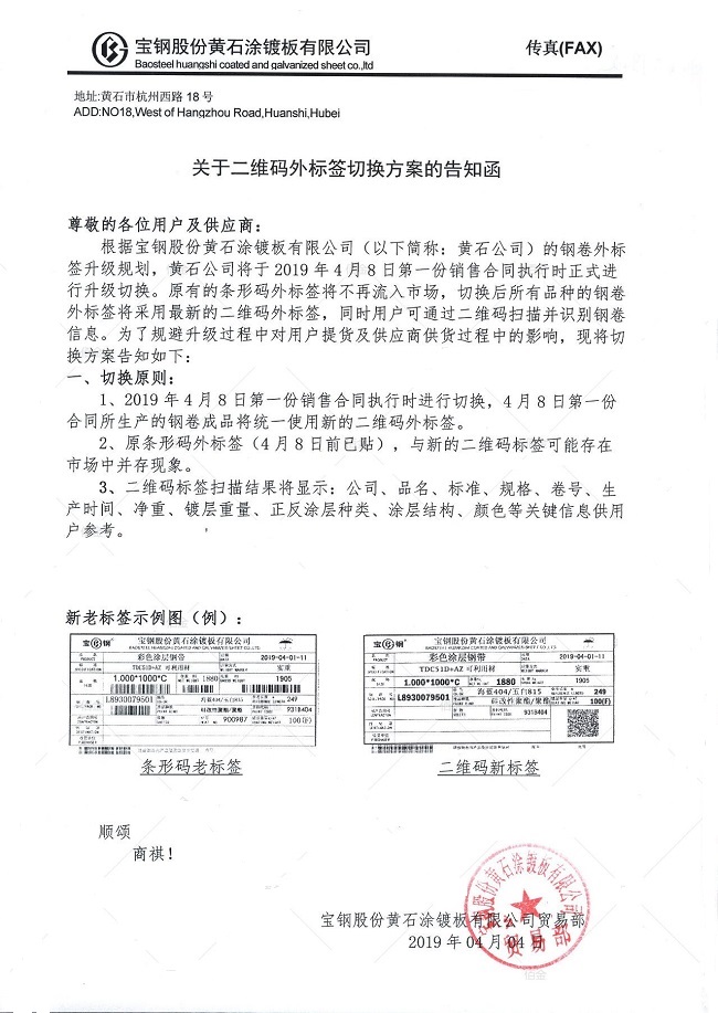 根據寶鋼股份黃石涂鍍板有限公司(以下簡稱:黃石公司)的鋼卷外標簽升級規劃,黃石公司將于2019年4月8日第一份銷售合同執行時正式進行升級切換。