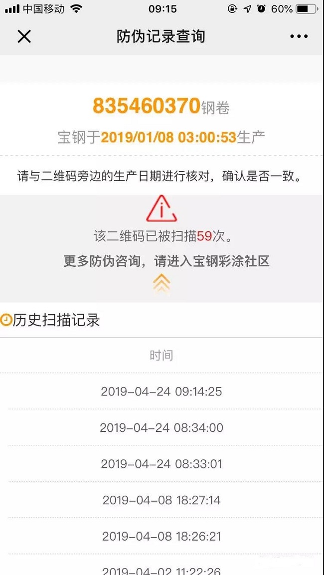 防偽記錄查詢中顯示此彩涂卷的捆包號,生產時間(精確到秒)以及該二維碼被掃過幾次,掃碼時間均在掃碼結果中一一體現。