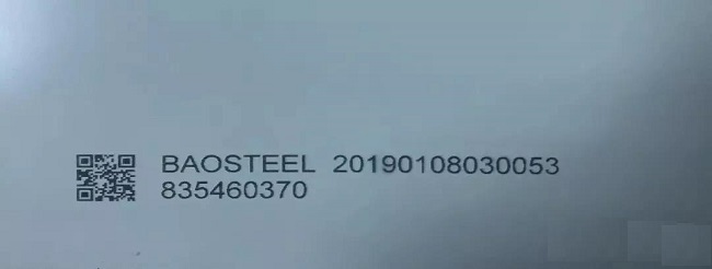 寶鋼股份青山基地二維碼采用與上海寶鋼同類型高速噴碼機,每間隔兩米均有一個二維碼,二維碼右邊英文字母BAOSTEEL是寶鋼的英文縮寫,字母下方數字表示其鋼卷捆包號。如圖所示: