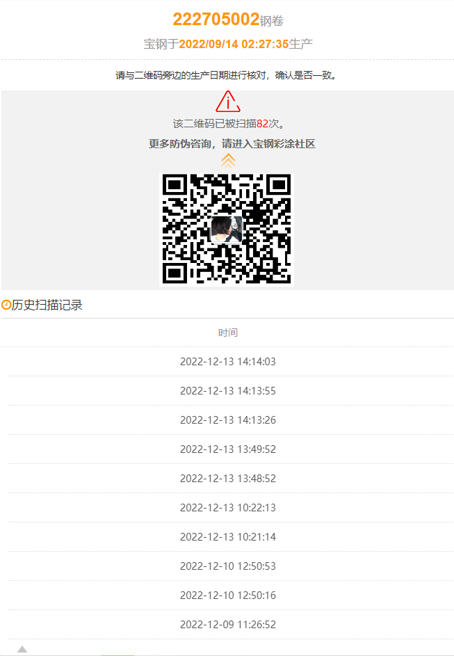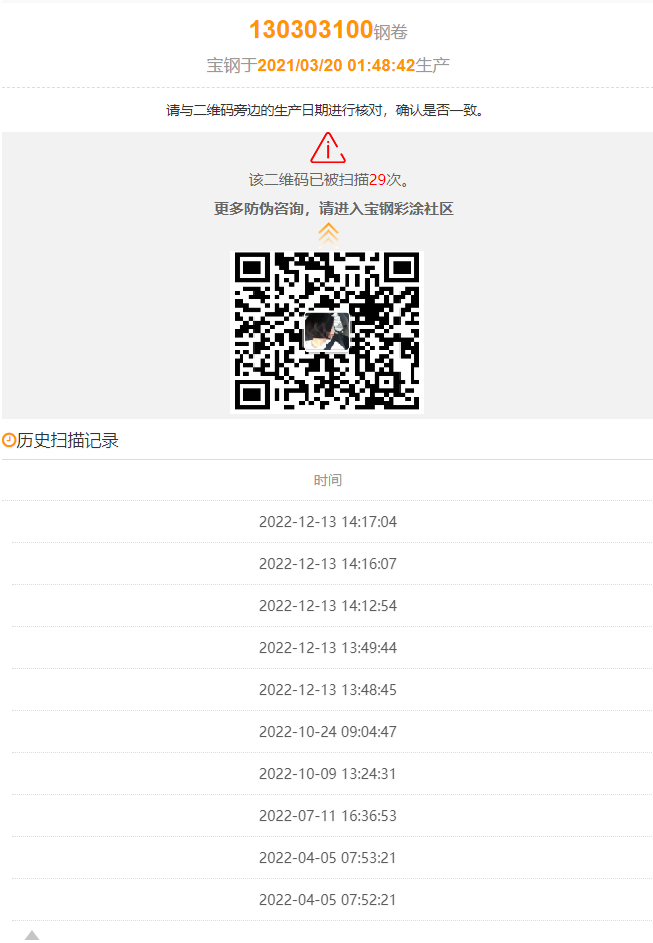 自動噴碼(英文+數字):Baosteel、卷號、顏色代碼后三位、涂料品種、鋼種;2016年將寶鋼彩涂板的防偽信息每隔2米以二維碼的方式標記在彩涂板背面,配合智能手機即可掃碼上網識別真偽,如圖所示: